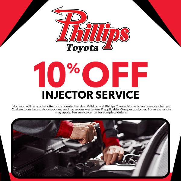 Not valid with any other offer or discounted service. Valid only at Phillips Toyota. Not valid on previous charges. Cost excludes taxes, shop supplies, and hazardous waste fees if applicable. One per customer. Some exclusions may apply. See service center for complete details.