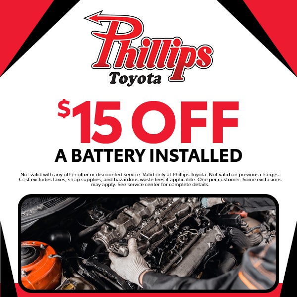 Not valid with any other offer or discounted service. Valid only at Phillips Toyota. Not valid on previous charges. Cost excludes taxes, shop supplies, and hazardous waste fees if applicable. One per customer. Some exclusions may apply. See service center for complete details.