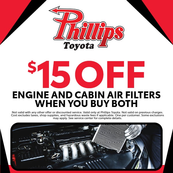 Not valid with any other offer or discounted service. Valid only at Phillips Toyota. Not valid on previous charges. Cost excludes taxes, shop supplies, and hazardous waste fees if applicable. One per customer. Some exclusions may apply. See service center for complete details.